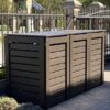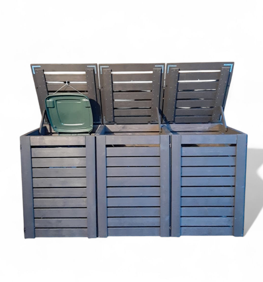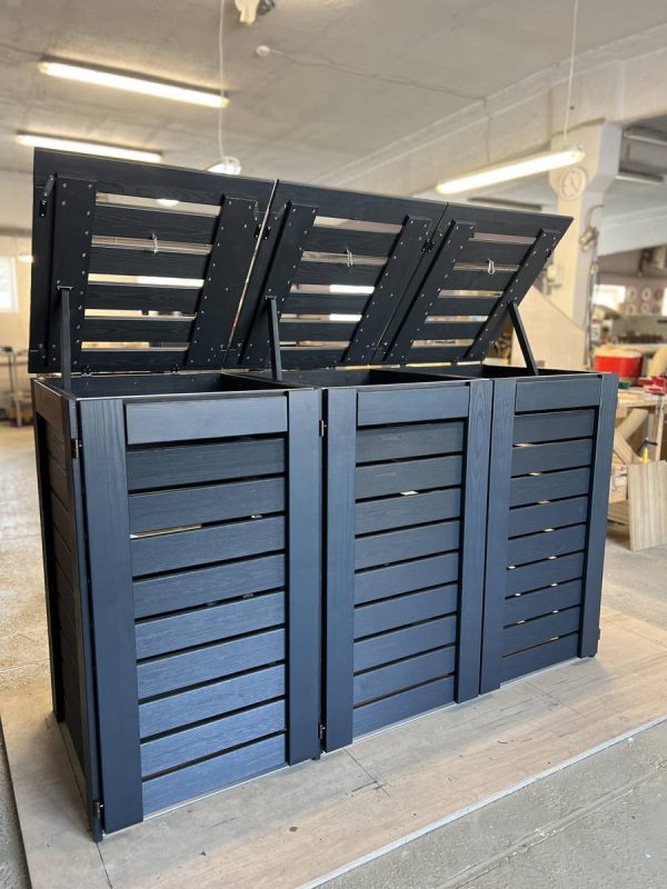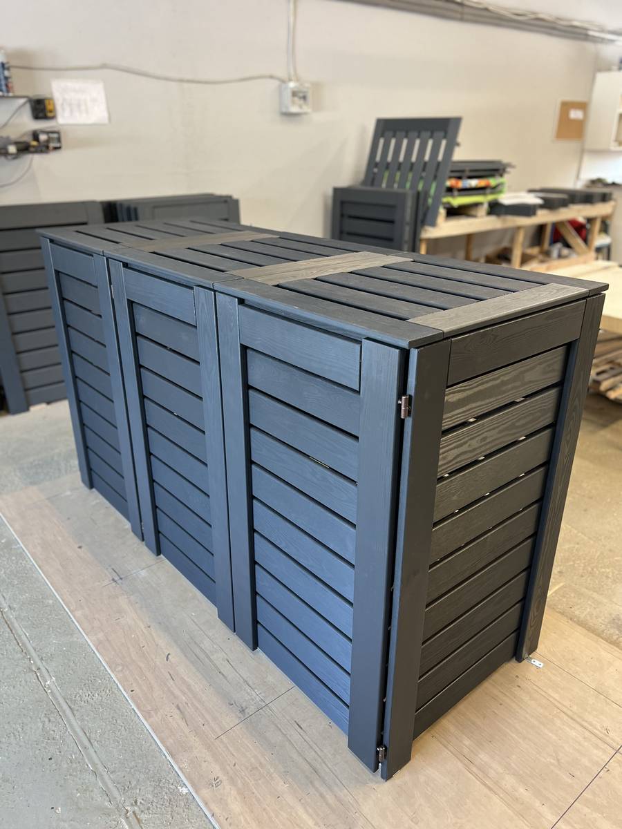 Perfect modern solution to hide outdoor bins. Easy setup and very sturdy construction. The sleek black slats look fantastic and keep my yard tidy. Highly recommend!
